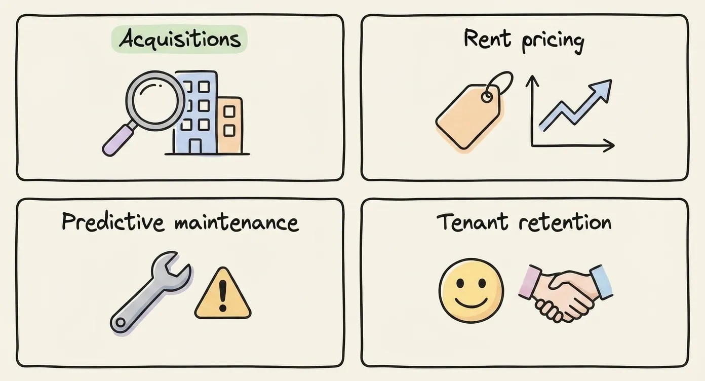 Underwriting: Using AI to model scenarios for cap rates, interest rate fluctuations, and market absorption rates.