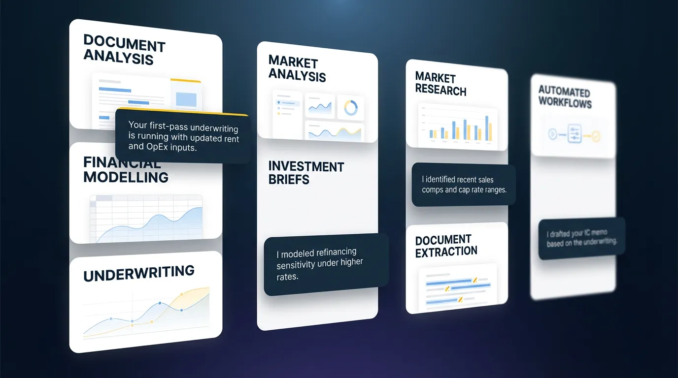 Acquisition teams evaluating 30 to 50 opportunities annually spend enormous bandwidth standardizing financial models and extracting key assumptions from offering memoranda. AI tools built for real estate now read rent rolls, operating statements, and market studies to populate underwriting models directly, cutting preliminary analysis time from hours to minutes.