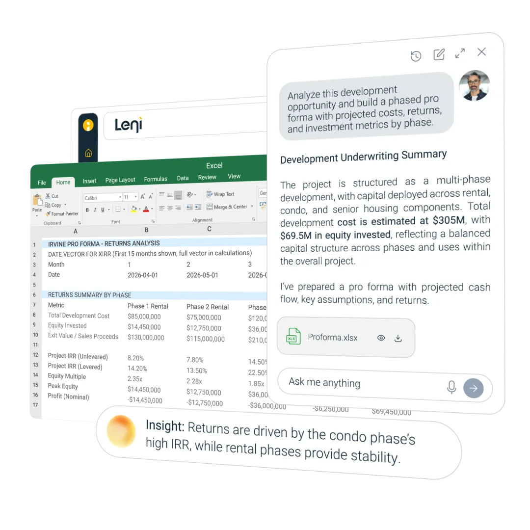 Leni reads your OM, rent roll, and T12, can independently do on-demand market research for first-pass underwriting in minutes, not a full day. Get an Excel workbook your team can open, edit, and present.