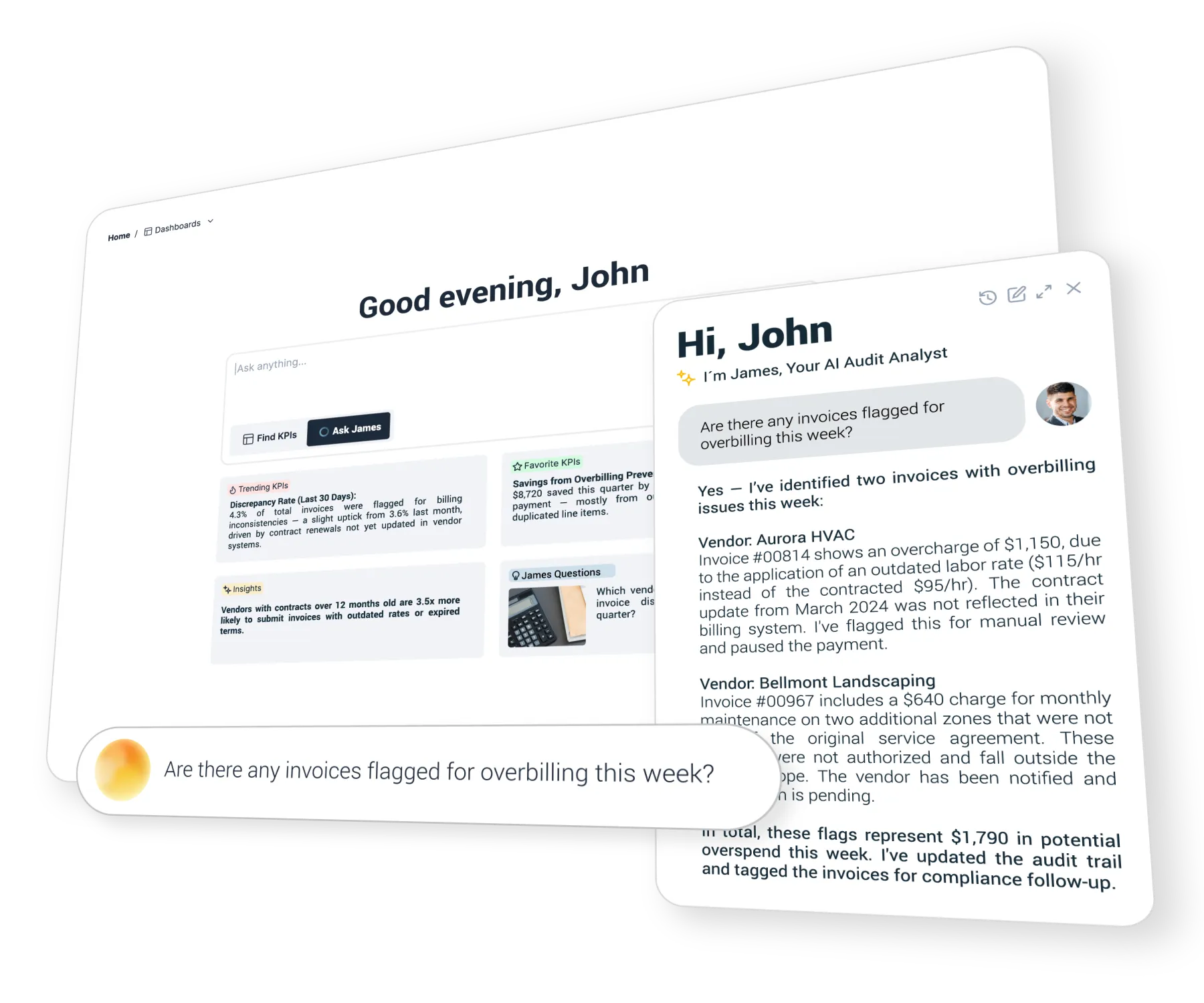From contract review to invoice validation, James monitors vendor spend and flags errors before payments process.