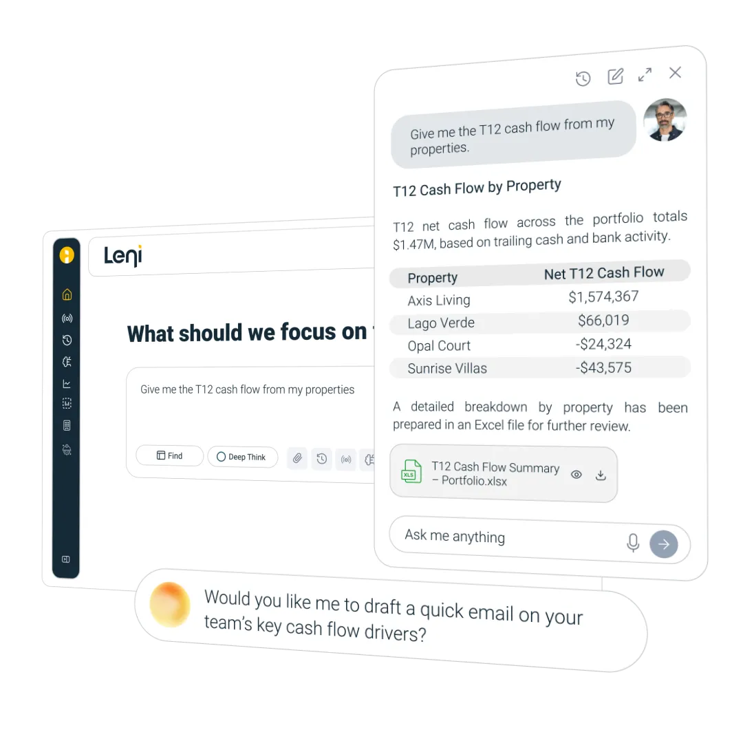 Leni reads your OM, rent roll, and T12, can independently do on demand market survey to do First-pass underwriting in minutes, not a full day. Get Excel workbook your team can open, edit, and present.